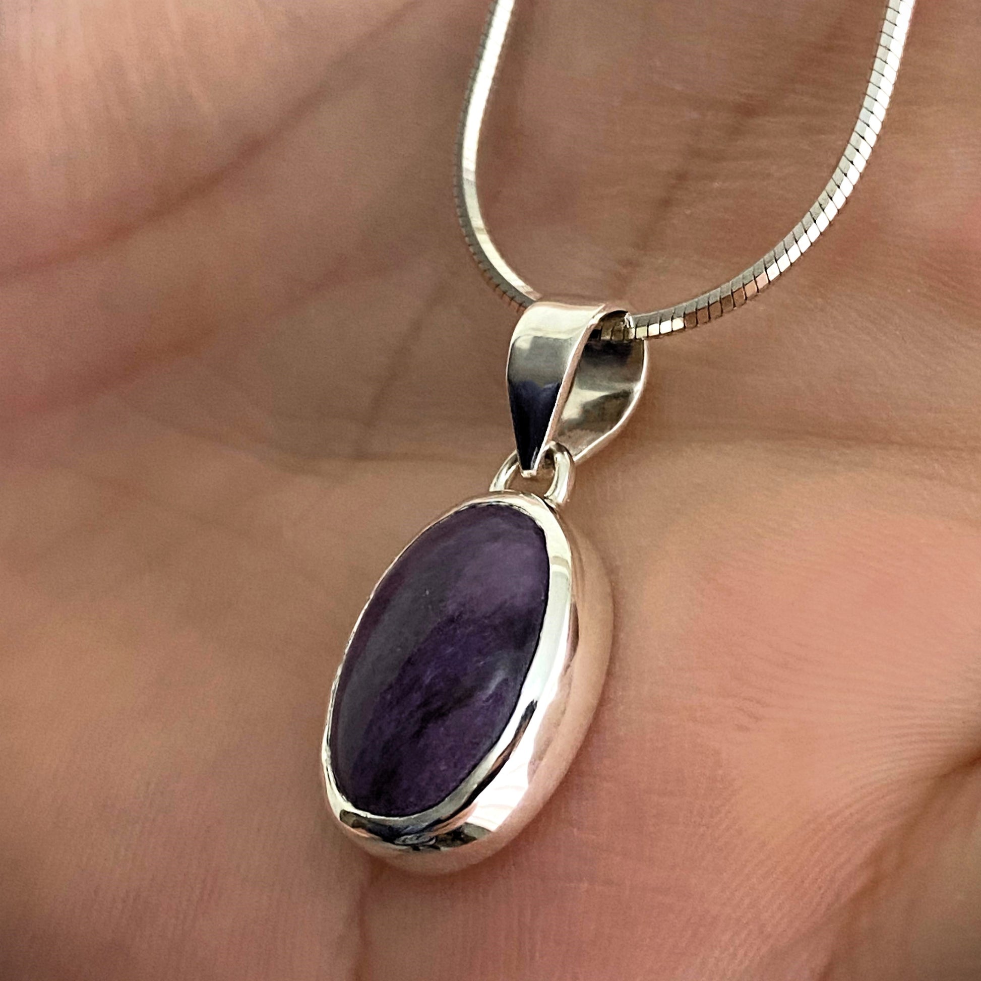 Colgante hecho totalmente a mano en Plata Ley 950 con piedra Charoita natural